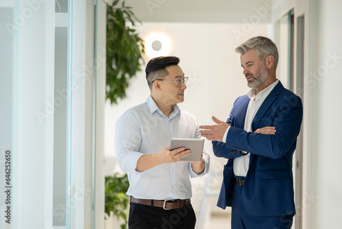 Obraz premium Men standing in corridor in office and talking about their work.