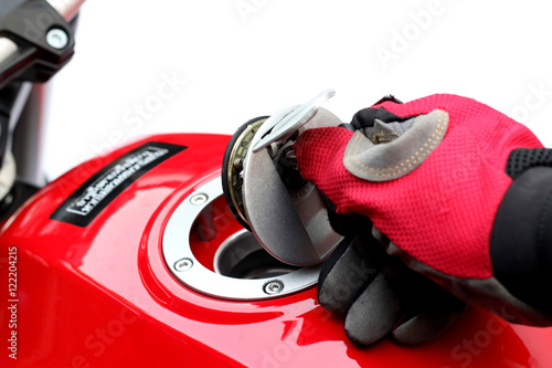 © ruksil, Fototapeta premium Men turn key motorcycle fuel tank.