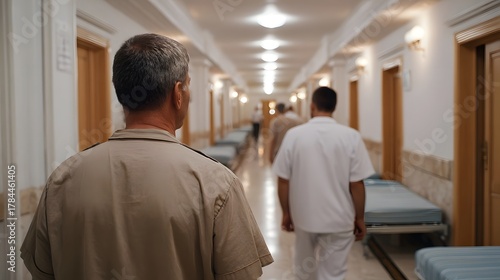© Bussakon, Obraz premium Men walking down a long institutional hallway lined with beds