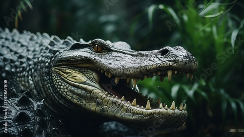 © AlexandraRooss, Obraz premium Menacing alligator with open mouth showcasing sharp teeth and textured skin, emerging from the dark waters of a lush green jungle habitat
