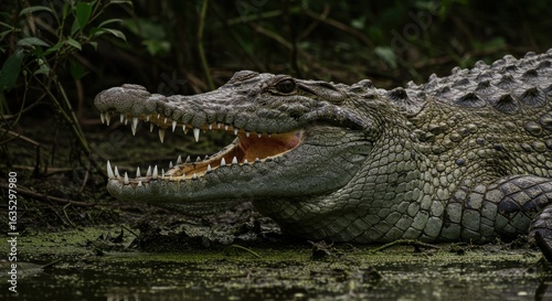 © Mangsur, Fototapeta premium Menacing Crocodile Portrait: Open Jaws, Sharp Teeth, and Textured Scales in Dark Swamp