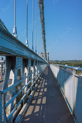 © Paul, Naklejka premium Menai Bridge Anglesey North Wales. Elevated footpath. Perspective of a historic suspension bridge under a clear blue sky.