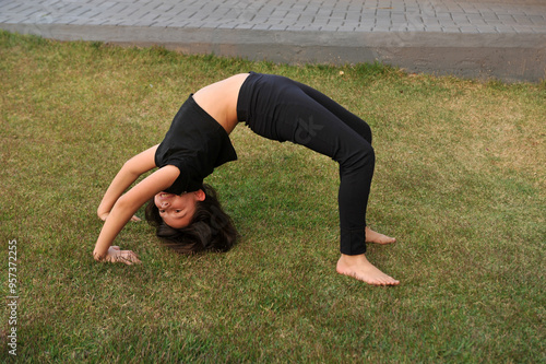 © Alexandre, Fototapeta premium menina fazendo exercicios ponte na grama
