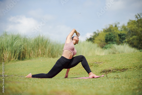 © Nasrul Ma Arif, Fototapeta premium Mental and physical health. A slender, tanned Asian woman in sportswear performs yoga outdoors in a beautiful riverside setting in the morning. The woman is performing the Extended Side Angle Pose.