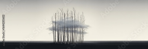 © Skyfe, Obraz premium Mental Health Editorial Header — Minimalist Panoramic Digital Composite Leafless White Birch Cluster Low Gray Cloud, Muted Beige Gradient Background, Dark Charcoal Foreground, Copy Space (Depression,