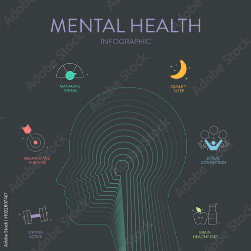 Naklejka premium Mental Health infographic diagram chart illustration banner presentation has managing stress, meaning and purpose, staying active, brain healthy diet, social connection and quality sleep. Icon vector.