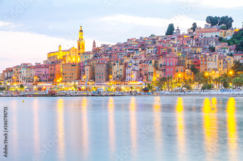 Naklejka premium Menton mediaeval town on the French Riviera in the Mediterranean during sunset, France.