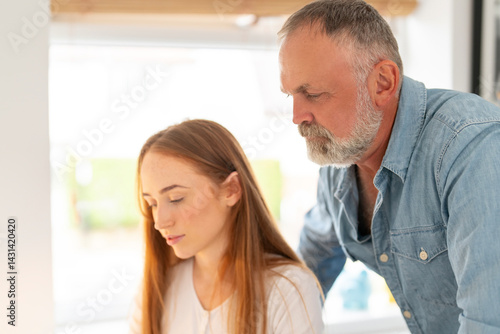 © Iryna, Obraz premium Mentoring session between older man and young woman in a bright, modern indoor space discussing ideas for a creative project