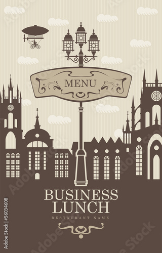 © paseven, Obraz premium menu for business lunches with the old town and a street lamp