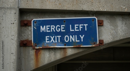 © Bismila, Obraz premium Merge Left Exit Only Sign on Concrete Structure with Rust Stains