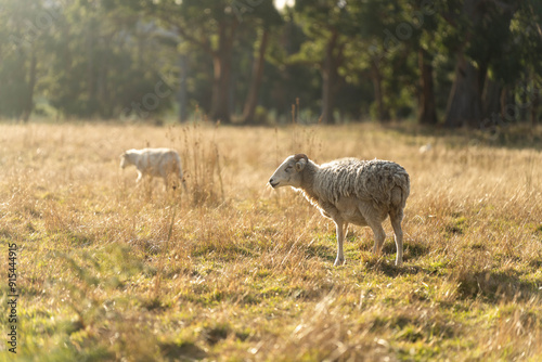 © Phoebe, Obraz premium Merino sheep, grazing and eating grass in New zealand and Australia with baby lambs