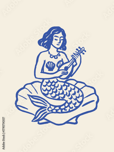 © Victoria, Naklejka premium Mermaid playing ukulele hand-drawn sketch vector illustration