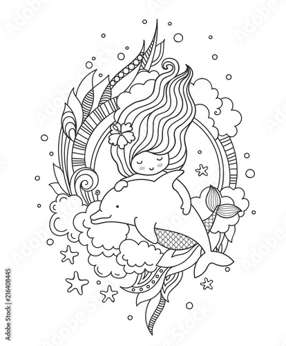 © Anastasia, Fototapeta premium Mermaid swimming among seaweed and clouds, with dolphin. Page for adult coloring book. Vector outline illustration.
