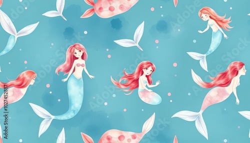 © Rahmat , Obraz premium Mermaids background with watercolor illustration, seamless pattern AI Generate