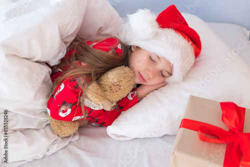 Obraz premium Merry Christmas and happy holidays. A cute little girl of 6-8 years old in a Santa hat is sleeping at home in bed hugging a Teddy toy, there is a gift box next to it.