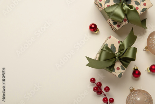 © elenabdesign, Naklejka premium Merry Christmas and Happy Holidays greeting card, frame, banner, border. New Year. Christmas red ornaments and gifts, presents on light beige background top view. Winter xmas holiday festive theme.