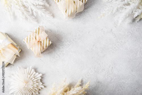 © elenabdesign, Fototapeta premium Merry Christmas and Happy Holidays greeting card, frame, banner. New Year. Christmas golden ornaments and gifts, presents on light background. Winter xmas holiday festive theme. Christmas decoration