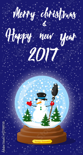 © Dunhill, Fototapeta premium Merry Christmas and Happy New Year 2017 banner. Cute glass Snow Globe souvenir. Snowflakes, christmas tree and funny Snowman. Cartoon style. Concept poster, flyer, greeting card. Vector illustration