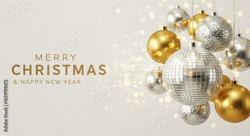 © Zohaibzahid , Fototapeta premium Merry Christmas and Happy New Year Festive Background with Disco Balls