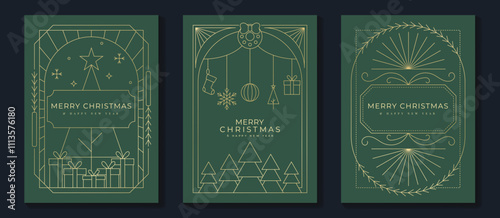 Fototapeta premium Merry Christmas and Happy New Year frame greeting card vector set. Luxury invitation with Christmas tree, bauble, holly, gift line art on green background. Design illustration for season's card, ads.