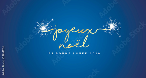 © simbos, Naklejka premium Merry Christmas and Happy New Year 2020 French language handwritten text tipography firework gold white blue background