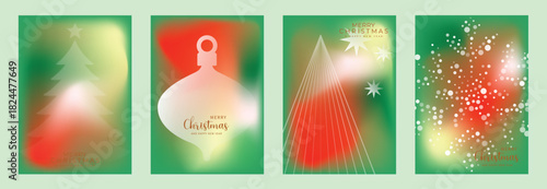Obraz premium Merry Christmas and Happy New Year greeting card vector set. Modern gradient invitation with Christmas tree, bauble, gift, spot texture on green and red background.