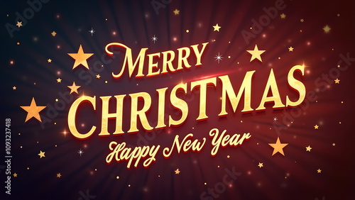 Fototapeta premium Merry Christmas and Happy New Year greeting card with golden text and stars. Holiday celebration concept.
