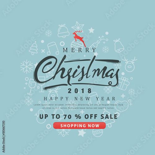 © bokmok, Fototapeta premium Merry Christmas and Happy New Year sale banner background with christmas icon set.discount gift voucher card for Xmas Holiday.Calligraphy.Vector illustration template.greeting cards.
