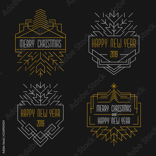 Obraz premium Merry Christmas and Happy New Year text. Art deco badges in outline style....