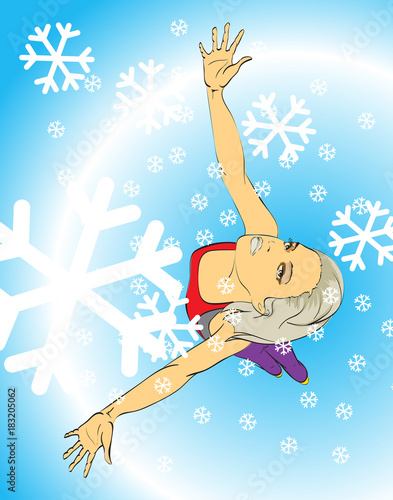 © Dzmitry Sukhavarau, Fototapeta premium Merry Christmas and Happy New Year vector card. Xmas illustration with girl and snowflakes. Beautiful festive bright decoration for holiday greeting cards. Christmas background