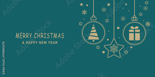 © Ruwani, Naklejka premium Merry Christmas and Happy New Year web banner, card and wall paper with vector illustrations. Hanging Christmas baubles and star with Christmas tree and gift in snowy background.