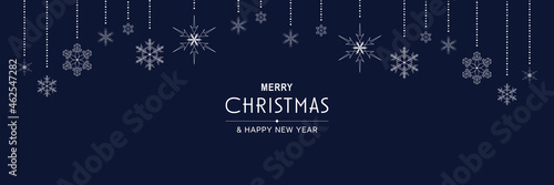 © alexdndz, Naklejka premium Merry Christmas and New Year 2022 poster. Xmas minimal banner design with hanging snowflakes and text on blue background. Horizontal festive header of website. Vector illustration for greeting card