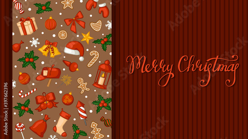Fototapeta premium Merry Christmas banner. Greeting card template decorated with traditional Christmas items. Vector illustration.