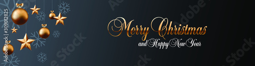© Alexey Ryumin, Fototapeta premium Merry Christmas banner or website header vector template. Calligraphic lettering with Christmas balls, stars and snowflakes on black background.