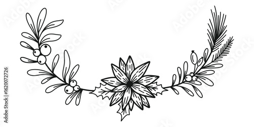 © Maroshka, Fototapeta premium Merry Christmas border with mistletoe, fir branches, twigs, holly leaves and berries. Holiday vector illustration. Nature design greeting card template. Winter xmas decoration.