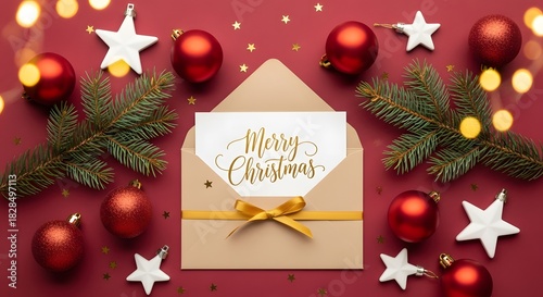 © sakib, Obraz premium Merry Christmas card in kraft envelope surrounded by festive red baubles and star ornaments