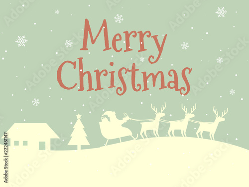 © Vegorus, Fototapeta premium Merry Christmas card. Retro style concept. Happy New Year design. Winter landscape and Santa Claus. House and Christmas tree. Vector illustration