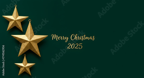 © Loki Stock, Fototapeta premium Merry Christmas Card with a Golden Star Decoration on a Dark Green Background for Celebration