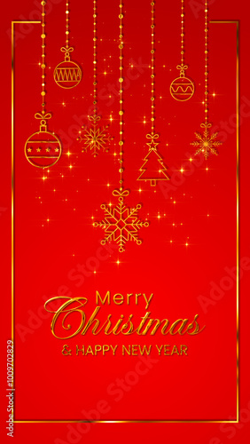 © Hasti, Naklejka premium merry christmas card with golden text and frame and ornaments,glitter stars on red background , new year and christmas eve vertical social media wallpaper