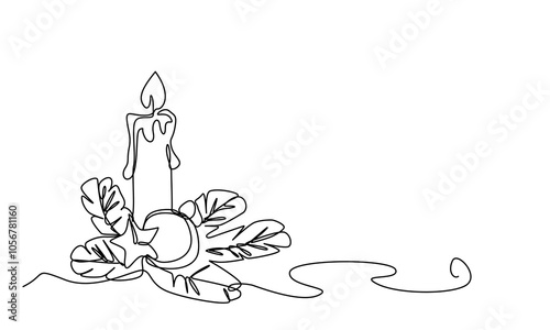 © Елена Явонова, Fototapeta premium Merry Christmas decoration. Line art. Continuous drawing of one line. Holiday card Christmas ball. Christmas ball, Christmas tree branches, star and candle. Vector