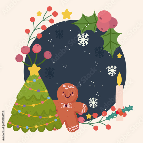 Obraz premium merry christmas gingerbread man tree snowflakes candle decoration frame