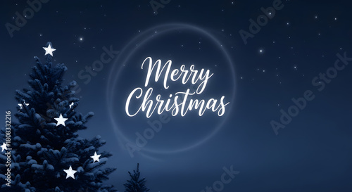 Fototapeta premium Merry Christmas glowing text with festive starry night sky and winter tree holiday background