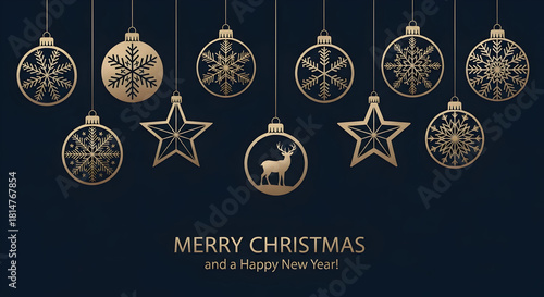 Fototapeta premium Merry Christmas greeting card with hanging ornament balls