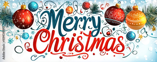 Naklejka premium Merry Christmas greeting with colorful ornaments and festive decorations, creating joyful holiday atmosphere