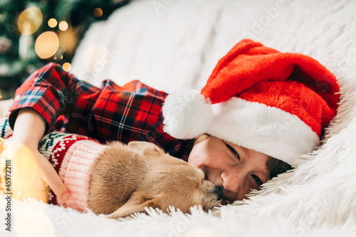 © Anna, Fototapeta premium Merry Christmas. Happy little child and puppy dog in sweater playing, hug and having fun on couch with blanket at winter holidays. Kid boy in Santa hat. Christmas tree with light bokeh. Happy new year