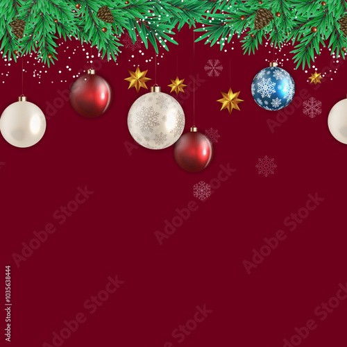 Fototapeta premium Merry Christmas, Happy New Year with christmas tree and balls. Realistic 3d elegant style. Winter Christmas background. Vector illustration