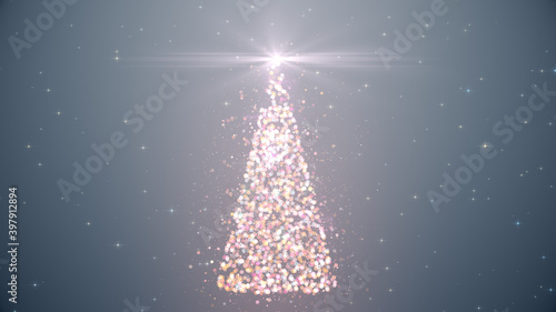 © kerenby, Naklejka premium Merry Christmas holiday greeting card. Glowing Christmas tree from particulars
