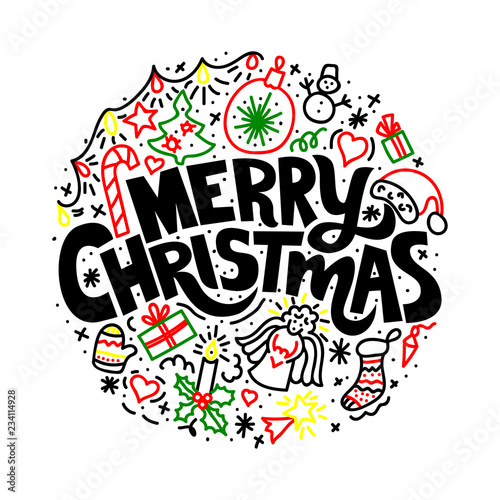 Fototapeta premium Merry christmas poster with hand lettering and doodle illustration of new...