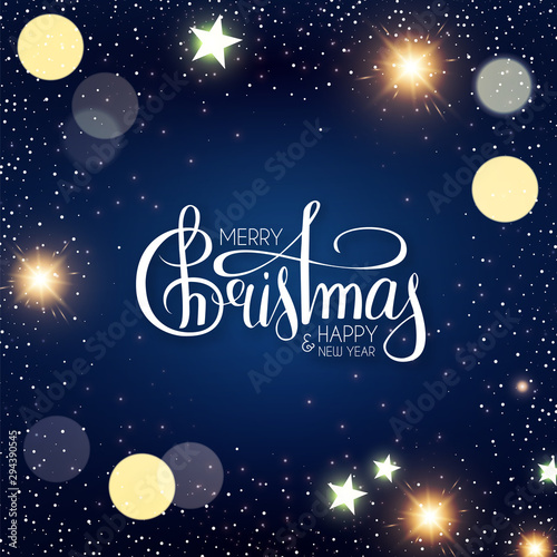Fototapeta premium Merry Christmas Shining holiday background with lettering, flash light, snow and bokeh effect.