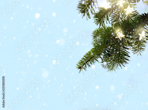 © Konstiantyn, Obraz premium Merry Christmas - snow and fir tree branches with holidays lights